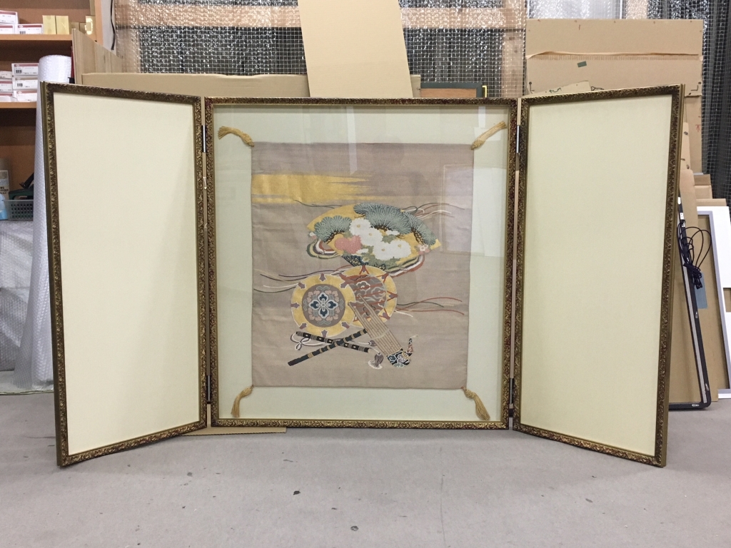 座布団を中心にして、丁番でつないで屏風風の額装をしました。